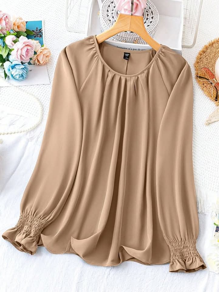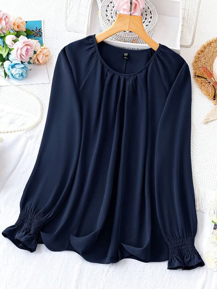 بلوزة أنيقة وان سايز بتصميم مميز وواسع، مناسبة لحد وزن 90 كجم بكل راحة وأناقة 💃. القماش ناعم وانسيابي، بيخليها مثالية للمشاوير اليومية أو الخروجات الكاجوال وحتى الرسمية ✨. الكمّ طويل وبيتميز بتكسيرات ناعمة عند المعصم بتدي شكل أنثوي راقي 🙋♀️. الرقبة دائرية مع طيات خفيفة تضيف لمسة أنوثة ونعومة 👗. ستايل مريح وواسع بيغطي الجسم بشكل أنيق من غير ما يحدد 👌
